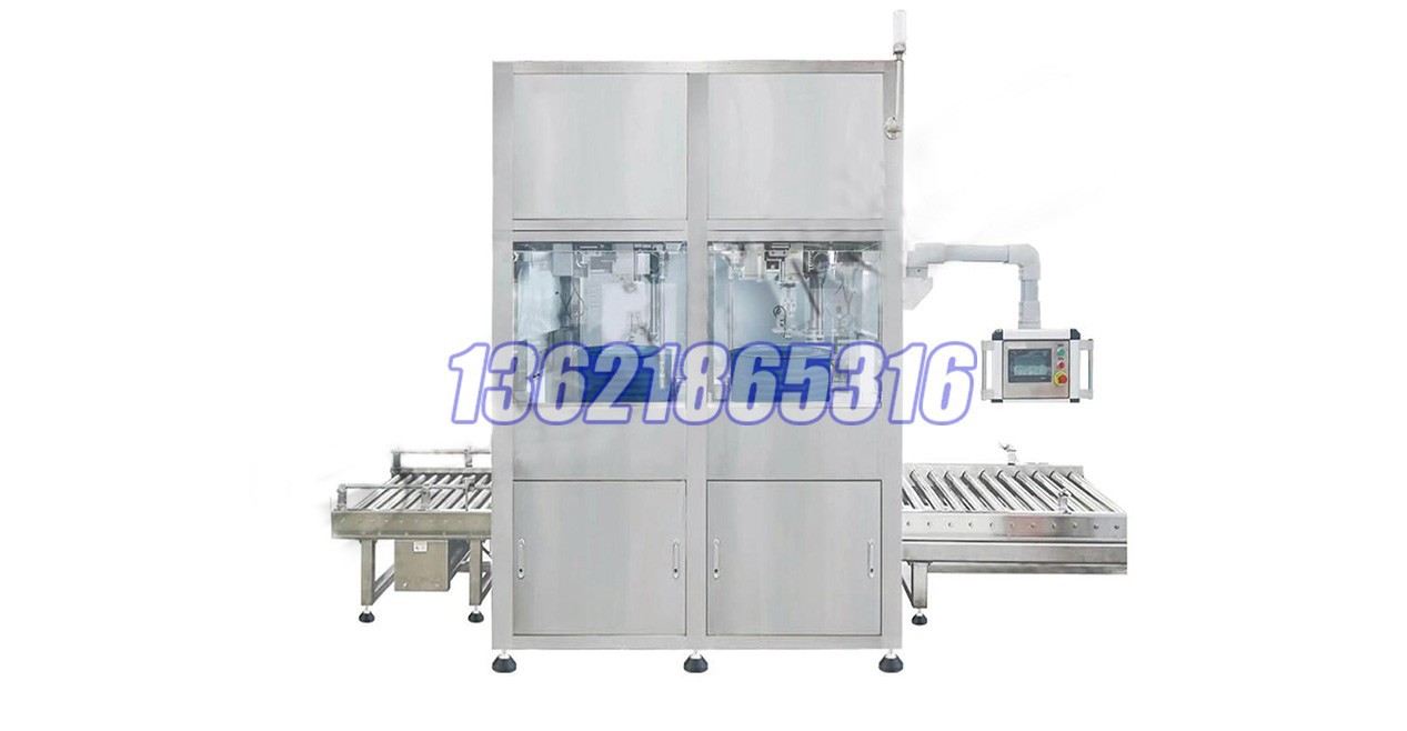 本機專門針對100-300kg的產品包裝而設計,本機利用稱重的工作原理來實現灌裝量的控制。物料自行流入(或通過泵供料輸送)待裝容器中去。通過粗細雙管路實現快慢灌裝,灌裝流量可調。在灌裝初始時雙管路同時打開,待灌裝至快灌裝設定量后,粗管路關閉,細管路繼續慢灌裝,直至設定的整體灌裝量。