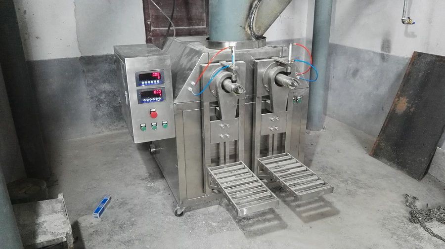 將閥口包裝袋套在加料嘴上,按動“允加”按鈕,這時壓袋氣缸開始工作并壓住袋口,控制器將包裝袋重量自動去除,破拱電機緩慢轉(zhuǎn)動,保證下料暢通。加料螺旋高速轉(zhuǎn)動迅速將物料灌入袋中,隨袋中空氣一起溢出的粉塵通過吸塵器由除塵器吸走,振動裝置同時啟動將托盤上袋中物料振實充滿袋角。待加料快到設(shè)定值時,加料螺旋進行減速慢加,到設(shè)定值時,加料停止。誤差<0.3%。這時壓袋氣缸松開袋口,翻袋氣缸將托盤翻轉(zhuǎn),將物料翻倒在皮帶輸送機上及時送出。