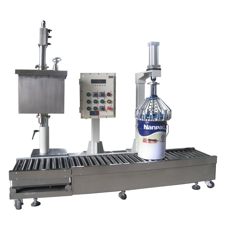 本設備是20L儲槽防爆式梅花壓蓋灌裝機廣泛應用于化工、糧食、農藥等與液體狀物料相關的行業,適用在聚氨酯、多元醇、聚醚、聚酯、樹脂、涂料、油漆、油墨、膠粘劑、固化劑、染料、清洗劑、機油、潤滑油、食用油、香精、溶劑、助劑、農藥及其他危險性化學產品等產品中。動作流程:當儲槽里原料低于下限位時,供料裝置自動打開給儲槽供料,當儲槽液位達到上限位時,關閉供料裝置。人工將空桶放到秤臺上,,然后點擊啟動按鈕,儀表
