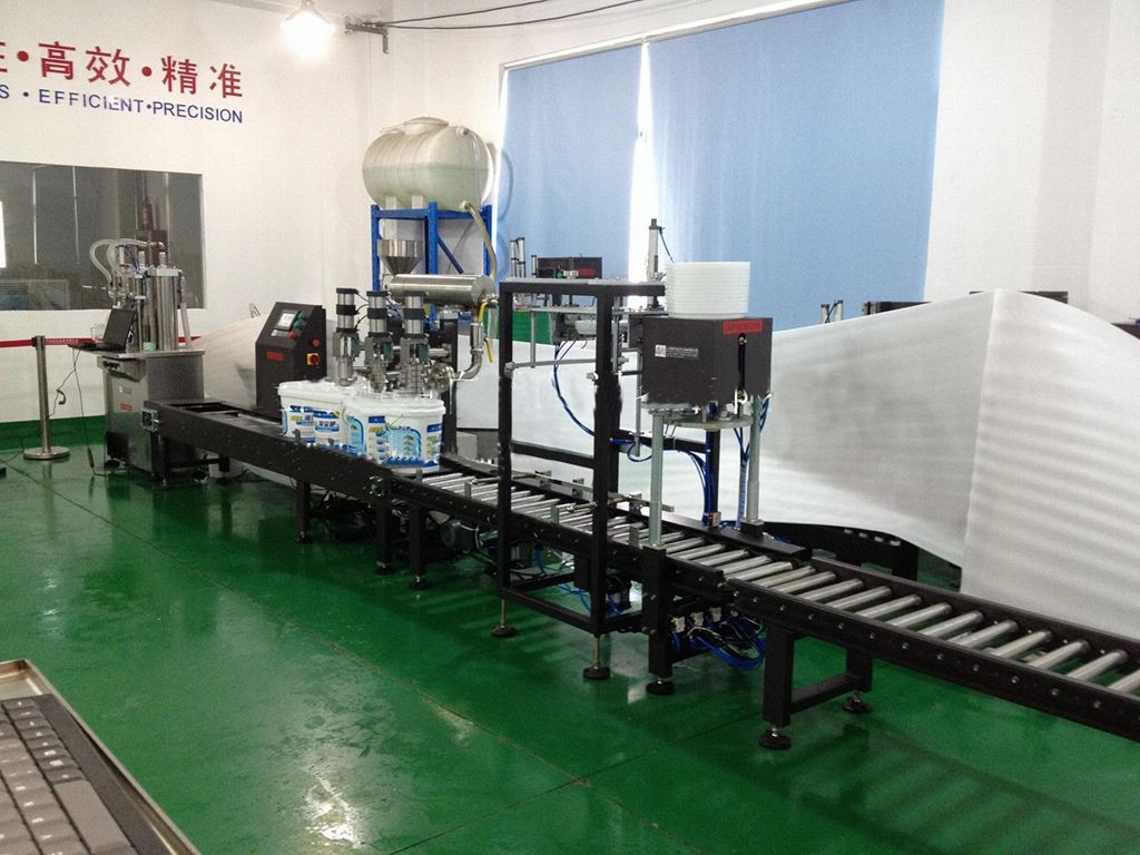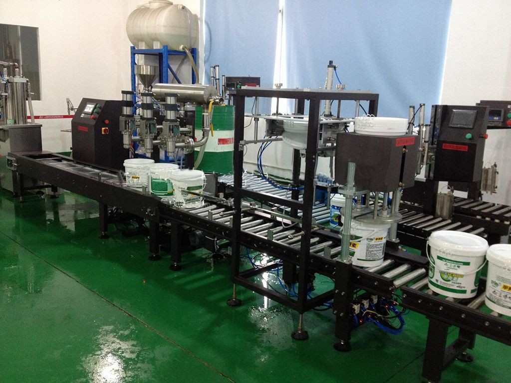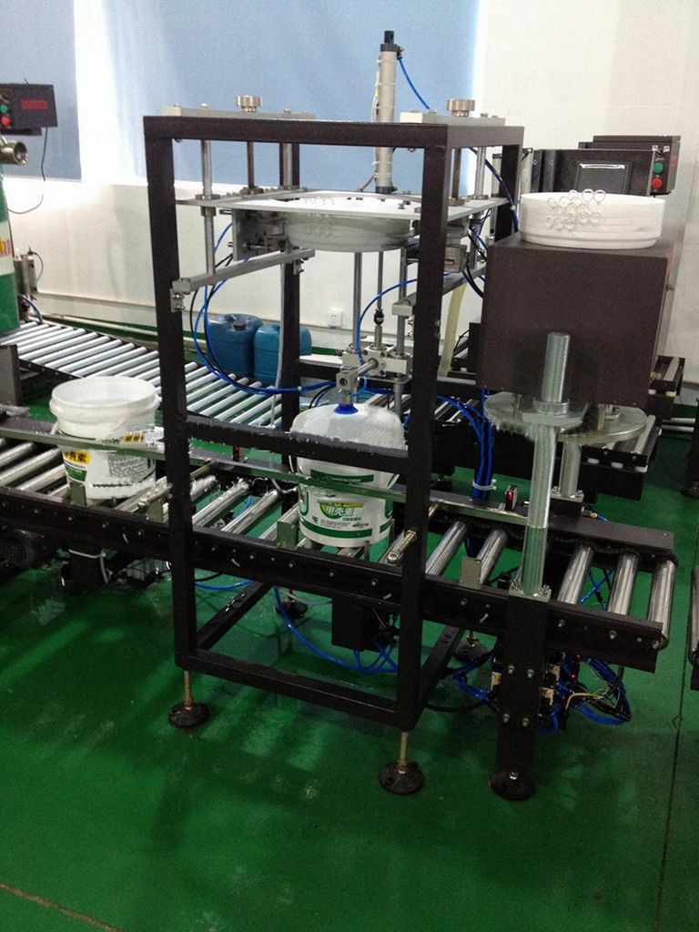 自動稱重灌裝旋蓋線工作流程:手動放桶---自動輸送----自動定位灌裝----自動落蓋-----自動壓蓋-----自動輸送。