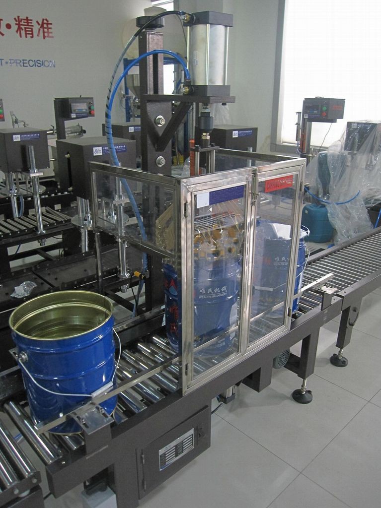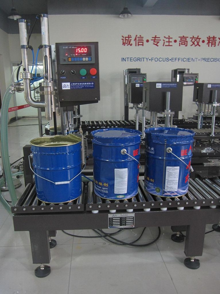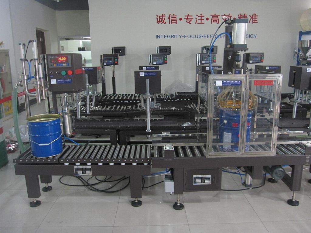 自動稱重灌裝旋蓋線工作流程:手動放桶---自動輸送----自動定位灌裝----手動放蓋 -----自動夾蓋-----自動輸送。