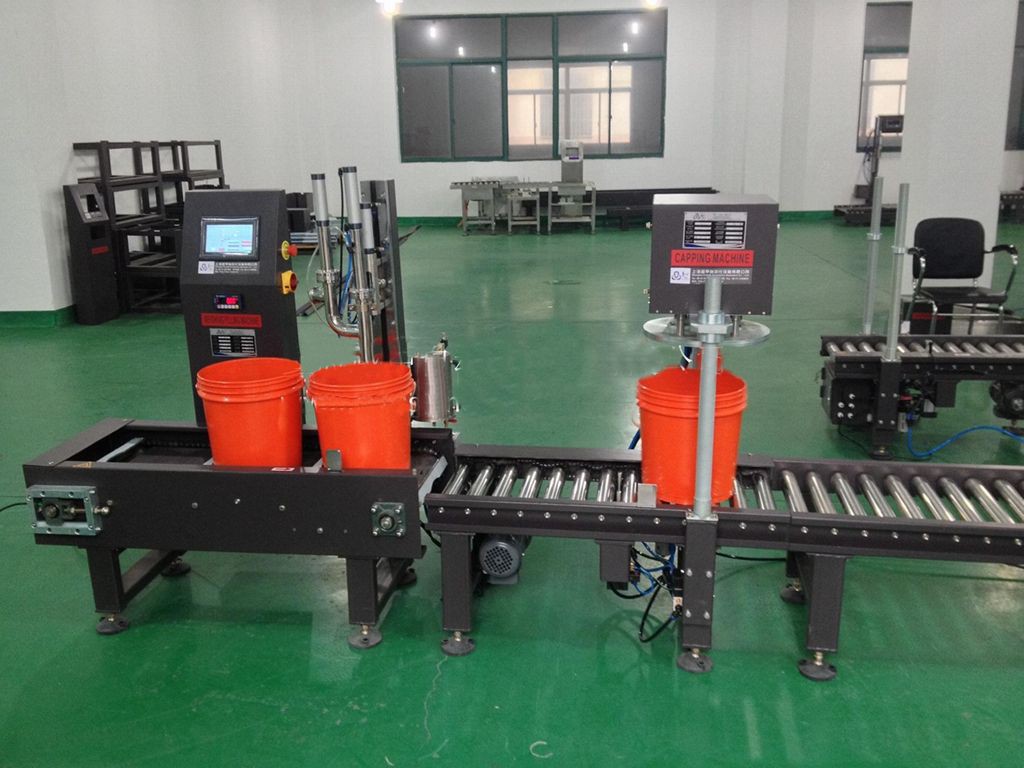 自動稱重灌裝旋蓋線20L 工作流程:手動放桶---自動輸送----自動定位灌裝----手動放蓋-----自動壓蓋---- --自動輸送。