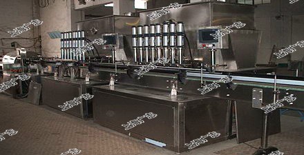 人工或通過上瓶機將空瓶放入鏈板輸送軌道,空瓶沿途經過進瓶分瓶機進行分割,等分后的瓶被輸送到灌裝工位下方,自動被檢測到瓶子,當出口第一個位置檢測到瓶子,進行側定位,側定位到位后,打開灌裝閥啟動灌裝絞龍,根據預先設定參數到設定值后,灌裝絞龍被停止,關閥、斷料,最后自動松開側定位送瓶進入下一道工序。