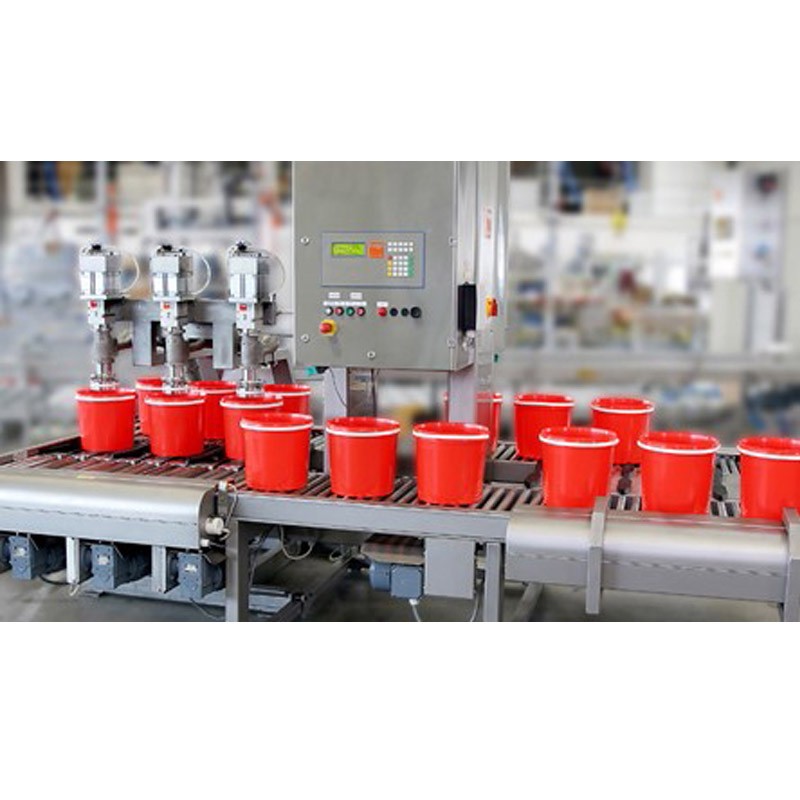 工藝流程:人工空桶上桶-自動(dòng)輸送空桶-自動(dòng)拔內(nèi)蓋-自動(dòng)灌裝計(jì)量-自動(dòng)關(guān)蓋-自動(dòng)重桶輸送