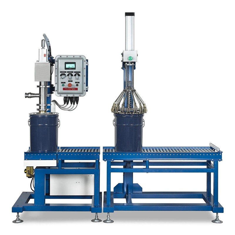 設備自動將空桶輸送到充氮區進行灌前充氮,充氮結束后,動力滾筒將包裝桶輸送至灌裝區進行灌裝,灌裝結束后,自動將滿桶輸送至上蓋區進行灌后充氮并自動上蓋,后端可模塊化配置自動貼標機,自動碼垛機。