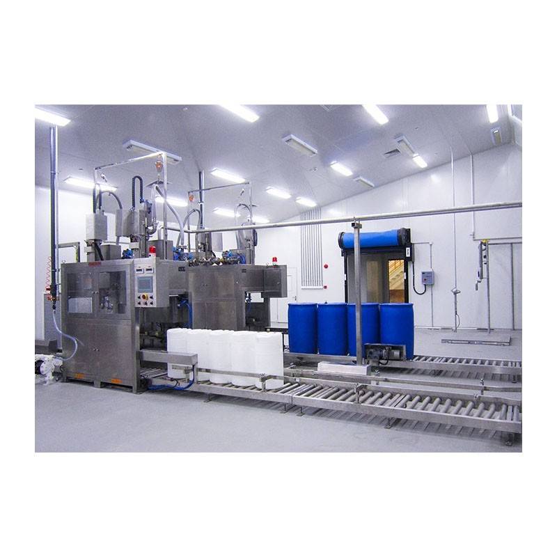 開機(jī)---人工放桶至秤臺(tái)快速定位對(duì)口--系統(tǒng)自動(dòng)偵測(cè)桶位、灌槍自動(dòng)插入桶口---自動(dòng)去皮---自動(dòng)打開灌槍及球閥組開始灌裝---大、中、小、微量四段式灌裝---到達(dá)目標(biāo)值--灌槍自動(dòng)關(guān)閉并升至 桶外---人工移桶至夾蓋區(qū)---自動(dòng)氣動(dòng)夾蓋---自動(dòng)推桶至?xí)捍鎱^(qū)---人工碼垛。