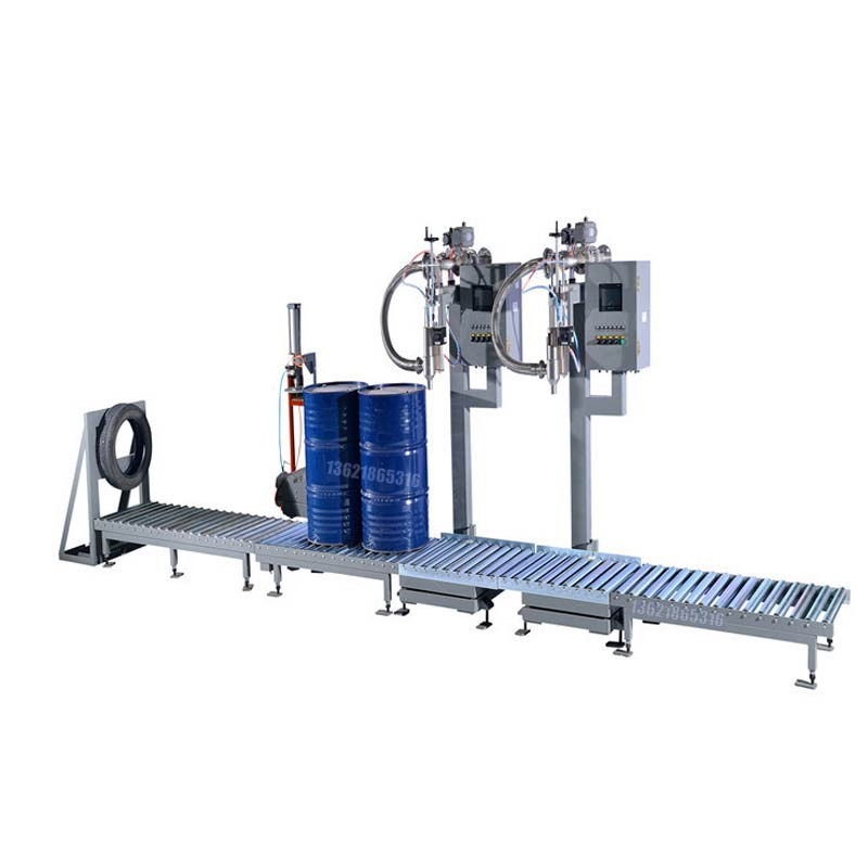 設(shè)計(jì)獨(dú)特的灌裝頭裝置易于操作,灌注快速、精確;并且最大限度地保證灌注完畢時(shí)殘液的滴漏。操作時(shí),操作者先將空桶開(kāi)蓋放置在空桶暫存區(qū)!輸送線自動(dòng)輸送至灌裝工位,灌裝機(jī)自動(dòng)對(duì)口。然后打開(kāi)灌裝閥門,精確地雙速灌裝;灌裝結(jié)束,灌裝秤頭自動(dòng)提升至桶外,滴漏盤自動(dòng)接至灌裝頭底部灌裝完成,輸送線啟動(dòng)自動(dòng)將成品桶輸送至鎖蓋區(qū),人工鎖蓋完成自動(dòng)輸送至成品區(qū),叉車叉走成品桶整個(gè)灌裝流程結(jié)束!