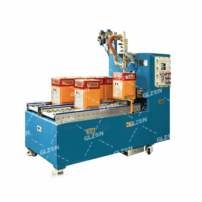 操作流程:操作時,操作者僅需簡單設定好灌裝重量,按下[啟動]按鈕,再將擺放到空桶輸送機上。灌裝機就會自動將空桶輸送到位并推入磅臺,然后自動將灌裝頭插入桶內,并將空桶自動去皮后打開灌裝閥門,精確地雙速灌裝;灌裝結束,灌裝頭自動提升至桶外,輸送機自動將灌裝完成的包裝桶送出,人工旋蓋并擺放到托盤即告完成。
