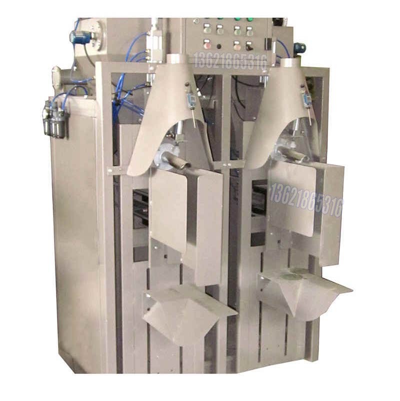 該機主要工作流程為設定好包裝重量后,人工將包裝袋套到氣動夾袋機構,啟動灌裝開始按鈕,夾袋機構自動將袋子夾住,然后往包裝袋中進行放料,放料過程分為粗加料和精加料兩個階段,且加料過程中可選配除塵及抽真空工藝。達到標定重量后,夾袋機構自動脫開,人工將包裝袋搬至皮帶輸送機上進行抽氣、封口等工序。