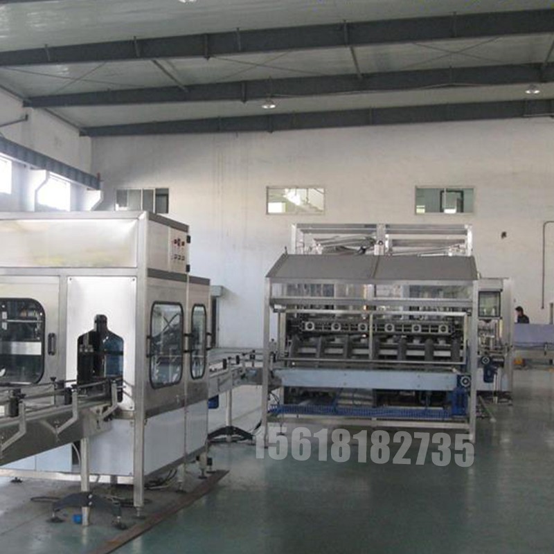 水處理系統選配的是否合理以及設備質量決定了成品質量及口感。但終產品的賣相及保質期還需靠一系列設備進行嚴格把關,實現全自動桶裝水生產線。一般從戶 外工地上回收回來的桶首先需要進行人工清洗,否則部分污物靠機器無法去除。全自動桶裝水生產線中,除水處理外,還包括自動拔蓋機(去除回收桶蓋)、自動內 刷桶機(使桶內雜質與桶內壁分開,便于后面的清洗)自動外刷桶機(將桶外表面及桶底刷洗干凈)、自動上桶裝置、5加侖灌裝機、燈檢設備(肉眼看桶內是否存在雜質,驗定是否合格)、蒸汽縮膜機(人工將膜套在桶口,經此設備高溫收縮后,膜緊貼桶口)、提桶套袋機(自動將桶提起在空 中,人工對其進行套袋)等主要設備。桶裝水灌裝機是整條全自動桶裝水生產線的**設備,對桶依次實現消毒、清洗、灌裝、封蓋。消毒工序根據客戶需求而決 定,依次分為以下幾道工序:高濃度消毒水消毒、瀝干、低濃度消毒水消毒、瀝千、回用水沖洗、瀝干、無菌水沖洗、瀝干,這樣的保證了桶的清潔度,也同樣實現了全自動桶裝水生產線,效率高、實用性強、且操作方便。